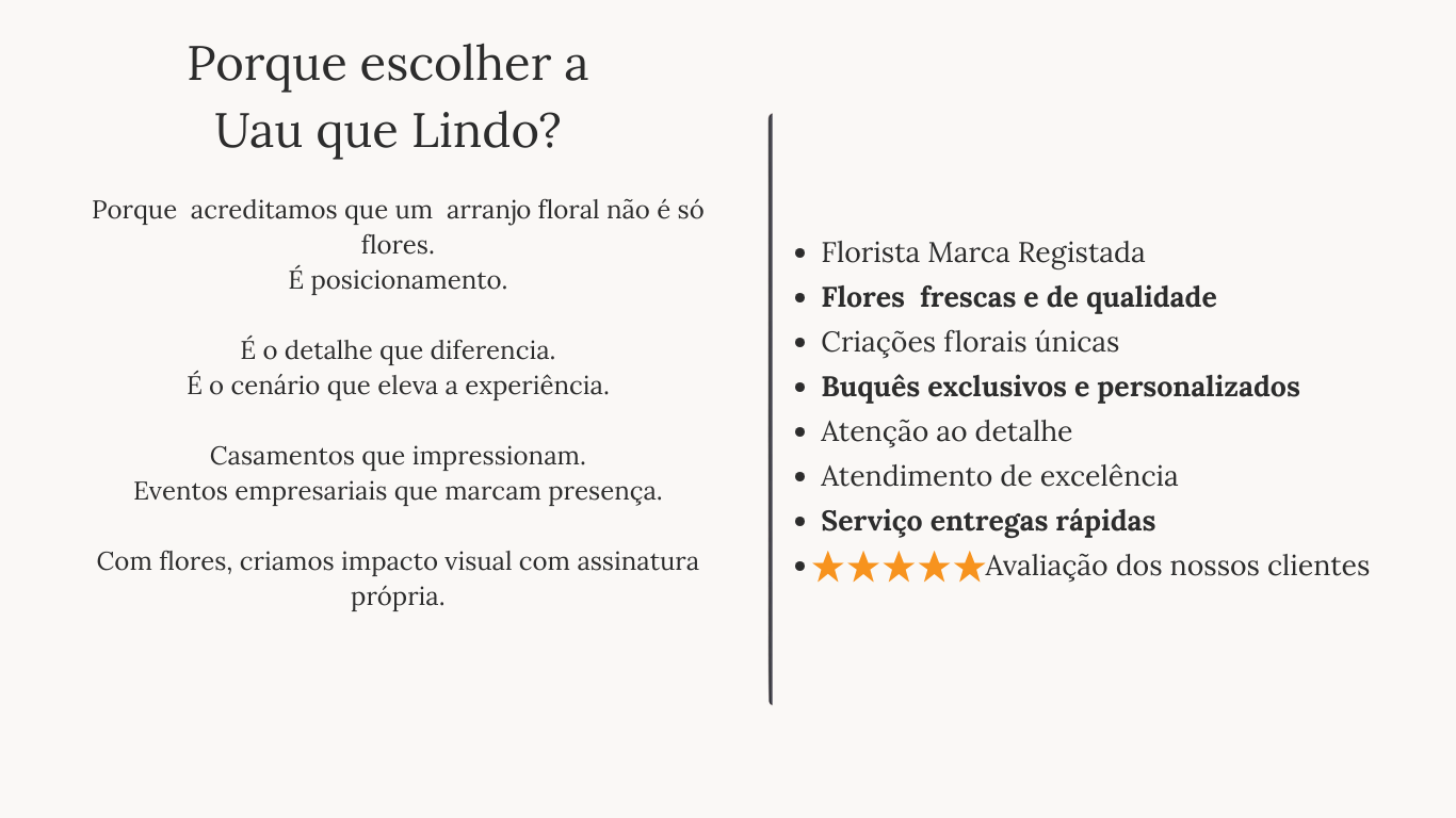 - Política de Devoluções – Devoluções apenas para produtos danificados ou defeituosos, garantindo frescura e qualidade Uau que Lindo